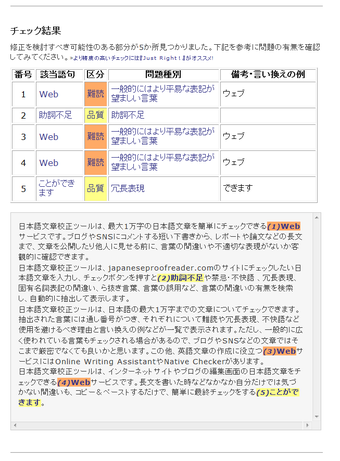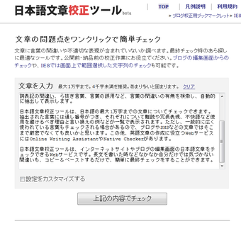 日本語文章校正ツールは、インターネットサイトやブログの編集画面の日本語文章をチェックできるWebサービスです。長文を書いた時などなかなか自分だけでは気づかない間違いも、コピー&ペーストするだけで、簡単に最終チェックできます。